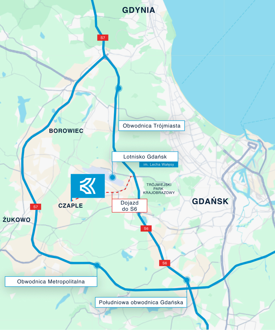 Lokalizacja zapewnia również świetne połączenie z Gdańskiem. Samochodem w krótkim czasie można dotrzeć zarówno na lotnisko, jak i do centrum miasta. W okolicy znajdują się także centra dystrybucyjne, które dla wielu mieszkańców mogą stanowić potencjalne miejsce pracy. Dodatkowym atutem są rozległe tereny leśne i zielone, idealne na spacery, outdoorowe aktywności oraz wspólne, rodzinne weekendy.